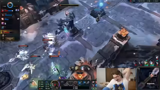11:43:48In der Mitte wird der Streamer von zwei Gegnern bedrängt, was zu einem chaotischen Kampf um Türme und Ward-Platzierungen führt. Eine erfolgreiche Ornn-Kombo wird erläutert, die Q und Ult kombiniert, um den Gegner in die Luft zu werfen und ihn mit Autotech abzufinieren. Trotz der erfolgreicheren Top-Lane wird der Drache verloren und die Bot-Lane als problematisch empfunden, was zu einem Rückzug und verpassten Chancen führt.