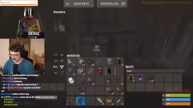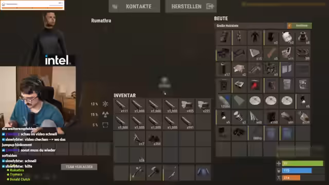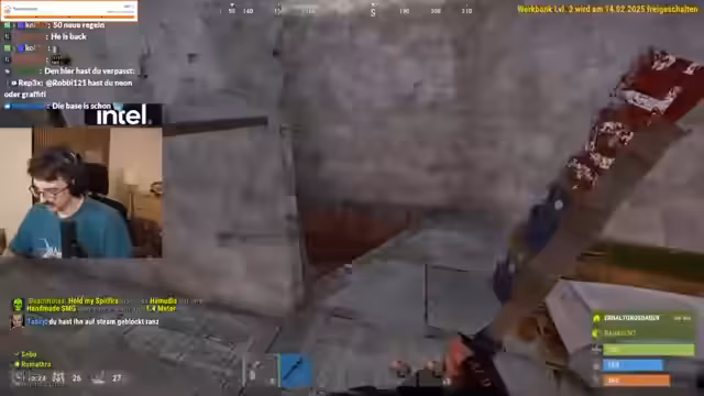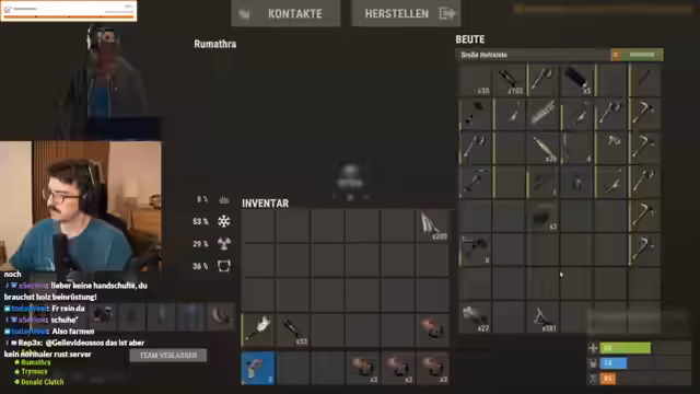 01:51:51Die Vorbereitungen sind abgeschlossen und der Streamer wechselt endgültig in den Rust-Server. Das Team 'Team 1' betritt das Spiel. Die Stimmung ist gemischt aus Vorfreude auf den Bau einer großartigen Basis und der Sorge, von sehr erfahrenen ('Pro') Spielern schnell eliminiert zu werden. Der Streamer äußert, dass die Laune des Streams stark davon abhängen wird, wie sich das Team in den ersten Minuten schlägt. Der Fokus liegt auf dem gemeinsamen Bau einer automatisierten Basis mit Kochen, Schmelzen und Herstellung.