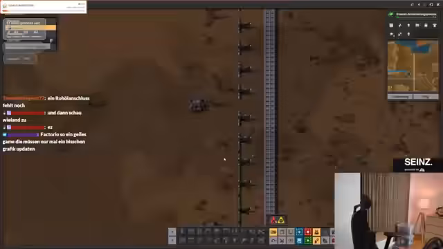 07:46:00Der Streamer plant, Express-Fließbänder, Strommasten und Bauroboter anzufordern, um die Effizienz auf Vulkanus zu steigern. Er überlegt, wie Wolfram-Karbid hergestellt wird und stellt fest, dass Kohlenstoff, Wolfram, Erz und Schwefelsäure benötigt werden. Da die vollautomatische Kohlenstoffherstellung möglich ist, soll der Wurm sie ausführen. Es wird diskutiert, wie Ressourcen von anderen Planeten angefordert werden können, insbesondere von Nauvis, um den Bedarf an Förderbändern und anderen Materialien zu decken. Der Streamer möchte, dass Schiffe automatisch zu Nauvis fliegen, die ausgewählten Ressourcen abholen und liefern. Es wird festgestellt, dass Raketensilos nicht benötigt werden, aber Anfragen von Raumplattformen weitergeleitet werden müssen. Der Streamer aktiviert die Weiterleitung von Anfragen auf allen Planeten, einschließlich Nauvis, und bestellt Bau- und Logistikroboter. Da auf Vulkanus kein Holz für Strommasten vorhanden ist, müssen diese ebenfalls geliefert werden. Es wird betont, dass alles auf Vulkanus geliefert werden muss, was die Bedeutung der vorhandenen Ressourcenbasis unterstreicht. Der Streamer baut eine Kohleförderanlage und stellt fest, dass eine Pumpe für die Schwefelsäure fehlt. Er improvisiert, indem er eine Pumpe abbaut und die Kohle zur Schmelzanlage bringt. Der Einsatz von Abraubrobotern würde die Effizienz erheblich steigern, sobald genügend Bauroboter vorhanden sind.