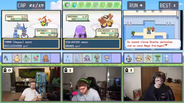 08:20:54Bevor sie in die Arenaleiter-Arena gehen, diskutieren sie, welche Pokémon sie auf Level 21 bringen sollen. Nach einer Entscheidung trainieren sie ihre Pokémon, während sie unerwünschte Trainerkämpfe vermeiden wollen. Sie entwickeln Karpador zu Kfigel und diskutieren dessen potenzielle Attacken wie Biss, Energiefokus und Durchbruch. Der Streamer ist begeistert von den Möglichkeiten von Kfigel, insbesondere nachdem er dessen Eigenschaft 'Solo' entdeckt hat, die Paralyse verhindert. Ihr Ziel ist es, ein vielseitiges und starkes Team für die Arena zu formen.