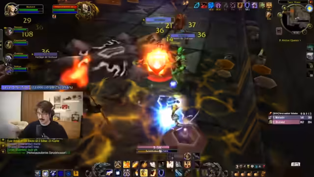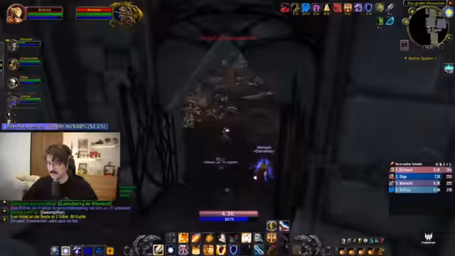04:36:44Die Gruppe betritt den Dungeon Strat. Der Streamer muss sich zunächst mit Segen der Weisheit buffen und vergisst dabei einen wichtigen Buff. Die Gruppe zieht in die erste Raumkontrolle und konzentriert sich auf den ersten Boss. Der Streamer agiert als Tank und zieht die Mobs auf sich, während die anderen Gruppenmitglieder Schaden verursachen und der Healer heilt. Man ist sich unsicher bezüglich der Taktik, jedoch wirkt die Zusammenarbeit bereits besser als erwartet.