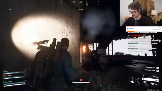 04:10:19Die Gruppe gerät in eine kritische Lage, als sie von einem Spieler auf dem Dach beschossen wird und eine Granate einschlägt. Die Spieler sind verwirrt über die Herkunft der Granate und vermuten zunächst eine Drohne, stellen aber schnell fest, dass es sich um feindliche Spieler handelt. Ein Spieler ist schwer verletzt und benötigt dringend Heilung, die jedoch aufgrund mangelnder Ressourcen schwierig ist. Die Gruppe versucht, sich in Sicherheit zu bringen und zu entkommen. Sie diskutieren, ob sie durch den Aufzug oder durch Springen entkommen sollen. Die Kommunikation ist angespannt, da die Spieler unter Druck stehen und sich gegenseitig zur Eile anhalten. Trotz der Schwierigkeiten versuchen sie, als Team zusammenzuhalten und einen Weg aus der gefährlichen Situation zu finden. Die Anspannung ist hoch, da sie befürchten, erneut von den feindlichen Spielern überrascht zu werden.