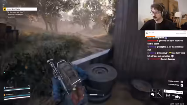 05:12:32Nach einer kurzen Installationsphase starten die Spieler in eine neue Runde Arc Raiders. Die aktuelle Quest besteht darin, eine Batterie in ein Felddepot zu bringen und ein Signal zu erneuern. Dies erfordert das Finden eines Felddepots, welches sich vermutlich im Sumpfgebiet befindet, obwohl der Weg dorthin sehr weit ist. Trotz der Entfernung entscheiden sich die Spieler, die Quest zu verfolgen und dabei auf dem Weg befindliche Gegner zu eliminieren. Währenddessen äußern sie sich begeistert über die Waffensounds im Spiel. Es kommt zu Kämpfen, bei denen die Spieler versuchen, Dominanz zu zeigen und sich gegen Drohnen und andere Gegner zu behaupten. Sie nutzen Rauchgranaten, um sich vor Drohnen zu verstecken und erreichen schließlich einen Bunker. Die Diskussion dreht sich auch um die Effektivität der Rattler-Waffe und die Notwendigkeit, schnell durch den Sumpf zu navigieren, um einer verfolgenden Drohne zu entkommen. Ein Felddepot wird lokalisiert, und die Spieler beginnen, die Antenne auf dem Dach zu reparieren, um die Quest abzuschließen.