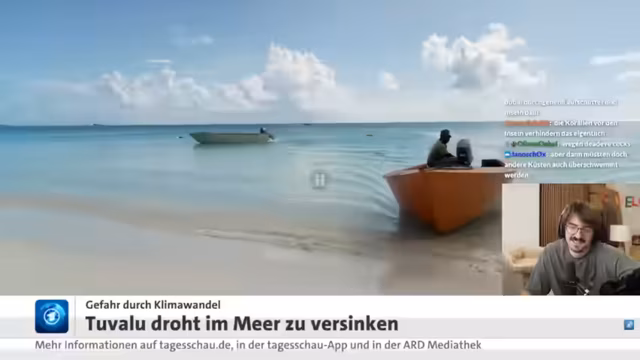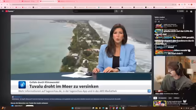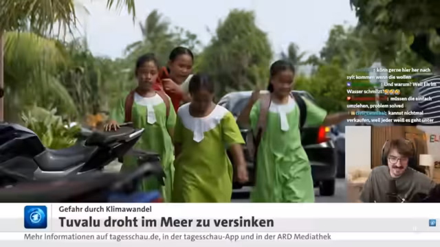 01:01:49Das Thema wechselt zu einer Reportage über die Klimakrise auf den pazifischen Inseln, speziell Tuvalu. Der Streamer berichtet von der existenziellen Bedrohung durch den steigenden Meeresspiegel, der das Land bedroht und die Flughafenlandebahn bereits gefährdet. Zeigt die Maßnahmen wie das Aufschütten neuen Landes und das Angebot eines 'Klimavisums' für Australien, und die Spaltung der Bevölkerung, die zwischen Bleiben und Gehen hin- und hergerissen ist.