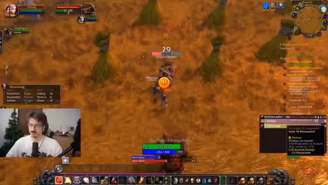 11:40:47Der Streamer beschäftigt sich intensiv mit dem Leveln seines Paladins in Westfall. Er erinnert sich an nostalgische Momente aus seiner Zeit als World of Warcraft-Spieler und navigiert durch die Zone, um Quests wie 'Bingles' schläft ein' abzuschließen. Dabei wird deutlich, dass er zwar Spaß am Erkunden hat, aber gelegentlich über das Inventarmanagement und die Aufgabenauswahl frustriert ist. Er nimmt Quests an, ohne genau zu wissen, welche wichtig sind, und sucht nach bestimmten Lehrern für seine Fähigkeiten, um seinen Charakter weiterzuentwickeln und für zukünftige Herausforderungen vorzubereiten.