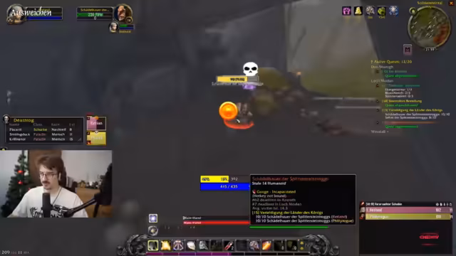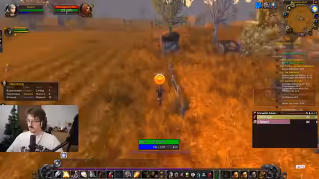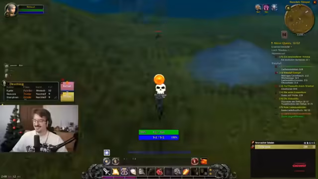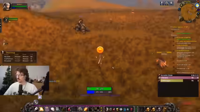 06:56:45Der Streamer spielt World of Warcraft und erlebt bei einem Kampf mit Benni Blanco einen kritischen Moment, bei dem er knapp dem Tod entgeht. Er diskutiert über den hohen Schaden, den der Gegner verursacht, und strategische Fehler wie das Fehlen von Heilzaubern. Anschließend unternimmt er einen Versuch, eine Quest abzugeben, muss jedoch feststellen, dass sein Heilzauber lang zu castet. Der Streamer beschäftigt sich mit der Mechanik seiner Fähigkeiten, insbesondere ob ein Heilzauber ohne Cast-Zeit verfügbar ist, und reflektiert über seine Lernerfahrungen im Spiel.