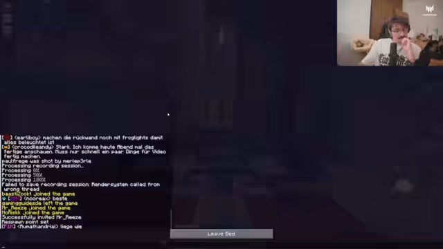 08:42:49Merle, ein weiterer Spieler, sorgt für Chaos, indem er einen Creeper in der Basis explodieren lässt, was zu einem Loch führt. Dies führt zu einer humorvollen Auseinandersetzung über Effizienz und die Unordnung, die Merle stiftet. Die Diskussion über die schlechte Luftqualität in den Zimmern der Spieler und die Schwierigkeiten, Fenster zu öffnen und zu schließen, wird fortgesetzt. Ein Spieler berichtet, dass er sich für die Option entschieden hat, das Fenster geschlossen zu lassen und die schlechte Luft zu ertragen, da das Öffnen zu umständlich ist und er Angst vor Regen hat. Die Herausforderungen der Belüftung in den Wohnräumen werden als 'basically ersticken' beschrieben.