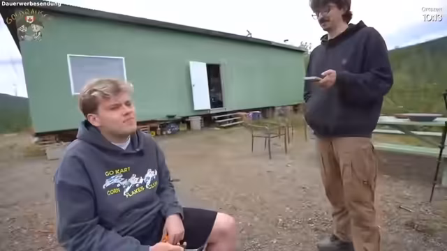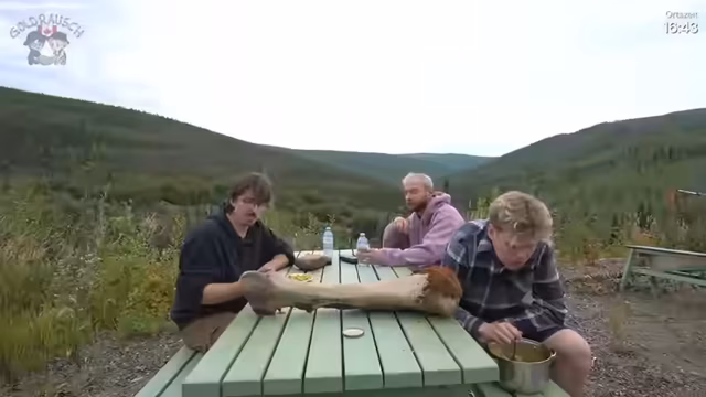 10:20:32Ein intensiver Arbeitstag liegt hinter ihnen. Sie sind frühmorgens aufgestanden und haben über 10 Stunden ununterbrochen geschuftet. Dazu gehören das Zerstören von Creepern, Goldschürfen, das Tragen von Regenjacken bei Regen, das Umstellen der Goldtrommel und gemeinsames Mittagessen. Ein bemerkenswertes Fundstück war ein großer Mammutkot, der casual auf dem Claim herumlag. Trotz der langen Arbeitszeit ist die Stimmung grundsätzlich positiv und der Fokus liegt auf der Erledigung der Aufgaben.