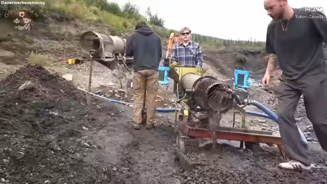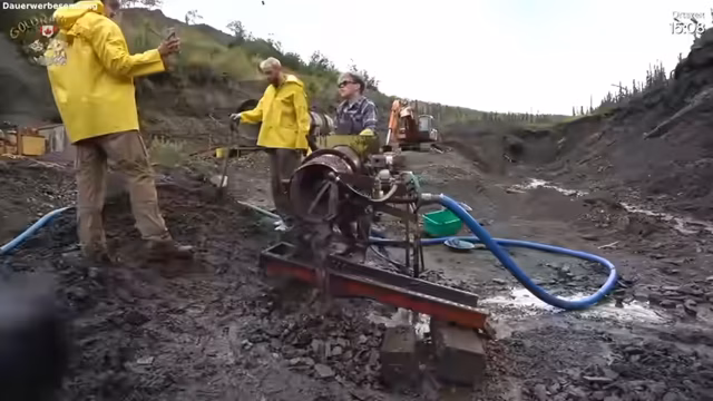 07:12:34Aufgrund des Regens wird eine Pause im Auto eingelegt, wobei einzigartige Bilder von der Crew im Bagger entstehen. Nach dem Regen wird das Goldschürfen fortgesetzt. Es wird ein verdächtiger, glänzender Stein gefunden, der möglicherweise Gold enthält. Die Theorie wird aufgestellt, dass es sich um einen Stein mit eingeschlossenem Gold handeln könnte, und die Möglichkeiten der weiteren Untersuchung, wie Zerreiben oder die Verwendung einer Schleuder, werden diskutiert.
