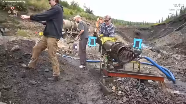 12:03:52Ein bemerkenswerter Fund wird im aufbereiteten Material gemacht: ein großer Knochen, der stark verwittert und schwarz ist. Es wird vermutet, dass es sich um ein sehr altes Fossil, möglicherweise von einem Mammut oder Bison, handelt. Während die genaue Art des Knochens untersucht wird, kommt es zu einer technischen Notwendigkeit: die Goldtrommel überhitzt und muss mit Benzin nachgefüllt werden, was eine ungeplante, aber notwendige Pause erzwingt.
