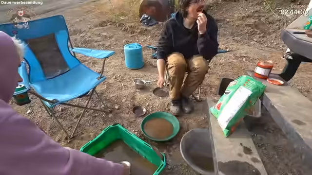 00:15:25Hauptaugenmerk des Stream ist das intensive Goldschürfen. Nach einiger Zeit des Suchens wird das erste sichtbare Gold in einer Waschpfanne gefunden, was als sehr befriedigend empfunden wird. Die Streamer teilen sich auf, um parallel in mehreren kleinen Pfannen material zu waschen und dabei Goldflocken zu separieren. Die Prozedur erweist sich als aufwendig und zeitaufwendig, da die winzigen Goldstücke aus der Erde isoliert werden müssen. Der Wert des gefundenen Golds wird zunächst mit bis zu 4.000 Euro geschätzt, was die Streamer begeistert.