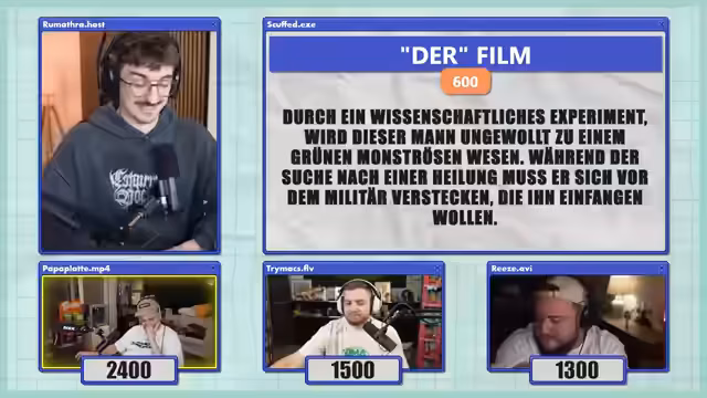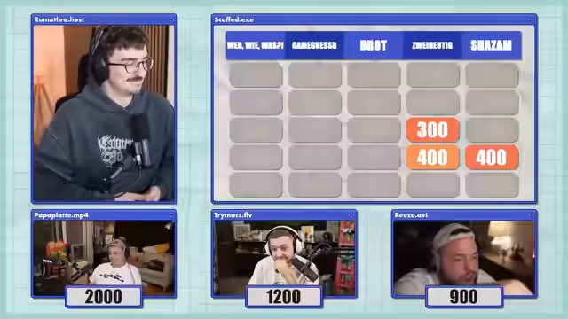 00:34:39Die Gameshow beginnt mit der Kategorie Brot, wobei Fragen zu verschiedenen Brotsorten und -produkten gestellt werden. Kevin, Max und Rezmann buzzern um die Wette, um die Fragen zu beantworten. Es folgen Kategorien wie Wer wie was, GameGuessr und Shazam, bei denen die Teilnehmer ihr Wissen in verschiedenen Bereichen unter Beweis stellen müssen. Es kommt zu Diskussionen über die Richtigkeit der Antworten und die Formulierung der Fragen. Kevin erweist sich als besonders schnell beim Buzzern, was zu Frustration bei den anderen Teilnehmern führt. Die Kategorien Zweideutig und Gemeinsamkeiten werden ebenfalls gespielt, wobei es um das Erkennen von Doppeldeutigkeiten und das Finden von Gemeinsamkeiten zwischen verschiedenen Begriffen geht.