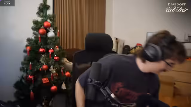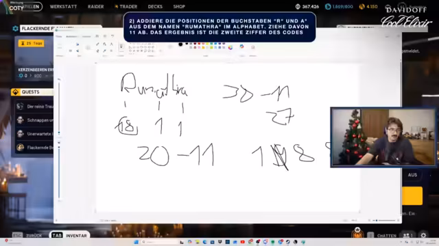 04:06:40In einem Sponsoring-Segment mit Davidoff Cool Elixir wird eine physische Schatztruhe präsentiert. Der Streamer muss einen vierstelligen Zahlencode durch Quizfragen lösen: Die erste Frage nach der Anzahl sichtbarer Weihnachtsbäume ergibt "1". Die zweite Frage verlangt die Addition der Buchstabenpositionen von 'R' und 'A' im Namen "Romatra" (R=18, A=1) minus 11, was zu "8" führt. Die dritte Frage lautet: Buchstabenanzahl des Davidoff-Gründervornamens "Zino" (4) mal 2 ergibt "8". Der Code "1-0-8" öffnet die Truhe, die Parfüms und Merchandise enthält. Davidoff wird für die Kampagne und die Giveaways gedankt.