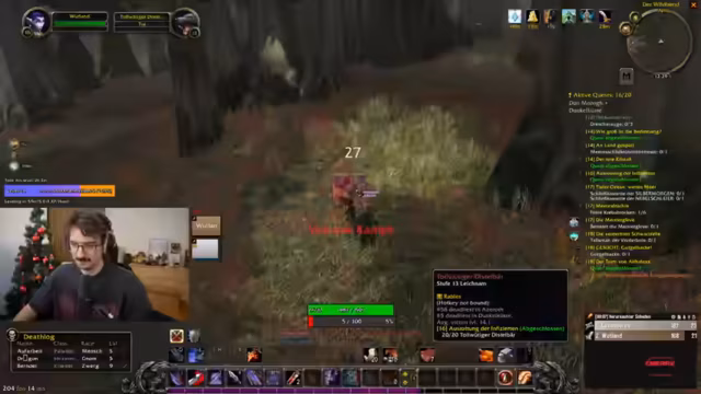 01:22:46Während einer Quest (Turm von Attallax) erklärt der Streamer Spielmechaniken wie Rüstungszerreißen und Verwunden. Es gibt Verwirrung bei der Interaktion mit Gegenständen wie 'Abgenutztes Pergament' und Schwierigkeiten beim Tanken von Gegnern. Der Streamer demonstriert, wie man Gegner mit Blutrausch und anderen Fähigkeiten managt, während er die Bedeutung von Aggro-Haltung und korrekter Rotation betont.