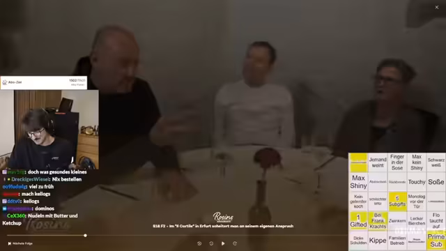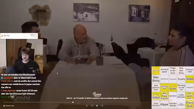 06:34:20Der Stream endet mit einer ansprechenden Atmosphäre und positiver Stimmung im Restaurant. Anschließend wird der Streamer Jumbo Schreiner und dessen Social-Media-Kontroversen besprochen. Jumbo ist bekannt durch Galileo und seine XXL-Gerichte. Seine wilde Internetpräsenz und seine Beef-Kultur werden thematisiert und die Kommentare seiner Trolle vorgelesen. Die gesamte Gruppe findet den Auftritt unterhaltsam.
