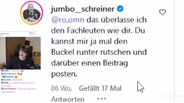 06:43:27Der Stream befasst sich eingehend mit dem Instagram-Account von Jumbo Schreiner. Es wird auf die wiederholte Nutzung desselben Bildes mit unterschiedlichen Sprüchen hingewiesen, was auf eine gezielte Content-Strategie hindeutet. Besonderes Augenmerk liegt auf seinem unkonventionellen Kommunikationsstil, der häufig durch sarkastische und beleidigende Antworten auf Kommentare geprägt ist, insbesondere gegenüber Kritikern.