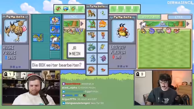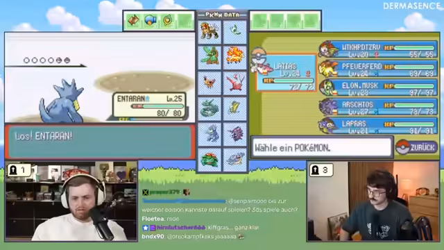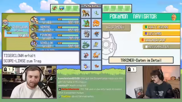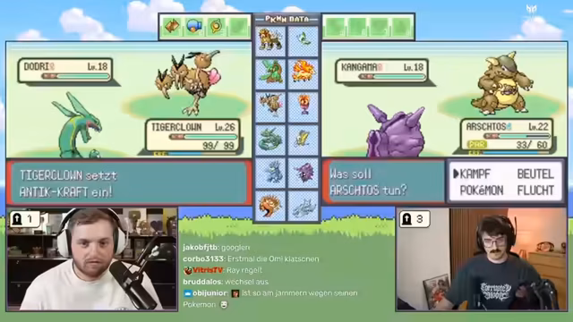 10:05:34Ein beliebter Streamer, Kroko, und andere Zuschauer wie Star Trainer und Keter King stoßen zum Stream hinzu und planen gemeinsam mit den Hosts eine 2-gegen-2 Soul Link Challenge im Pokémon Platin. Es entstehen Diskussionen über die genauen Regeln: Es geht darum, wer als Team am wenigsten Pokémon verliert, und nicht um das Erreichen des Zielorts. Gleichzeitig wird über mögliche zukünftige Herausforderungen wie Hard Gold und Soul Silver gesprochen.