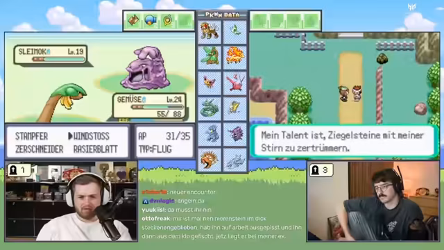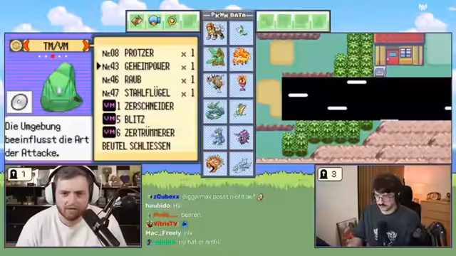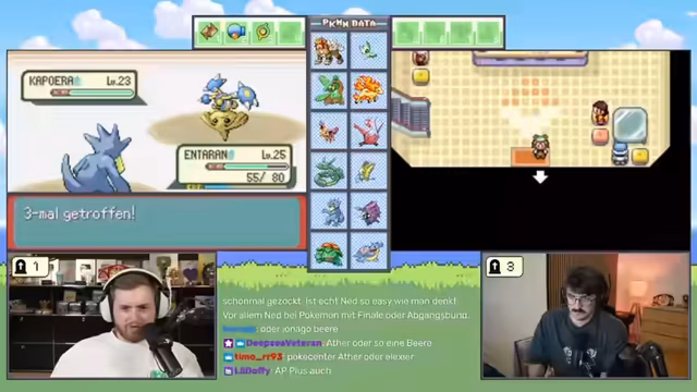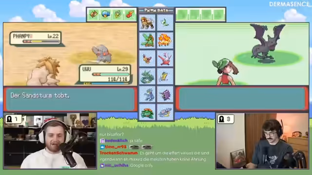 02:57:57Der Streamer erkundet die Route 115 und identifiziert Pokémon-Typen. Es gibt eine heftige Auseinandersetzung mit Trymacs, bei der Trymacs Rayquaza beinahe getötet wird. Der Streamer moniert die unfaire Level-Vorteile von Trymacs Team. Es kommt zu einem Kampf gegen den Trainer "Popa", bei dem der Streamer das Pokémon Papinella als "Arsch-Pokémon" bezeichnet. Er analysiert die Schwächen und Stärken seiner Pokémon gegenüber den Typen seines Gegners.