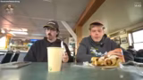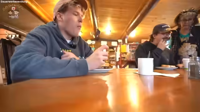 02:55:15Ein Streit mit einer Person namens Kim eskaliert, die laut Streamer die laute Musik im Fahrzeug sabotieren und als Diva bezeichnet wird. Nach diesem Vorfahren wird an einem kleinen Geschäft angehalten, das sehr urig aussieht. Der Streamer überlegt, sich eine Jacke zu kaufen, bestellt vegetarische Sandwiches und tauscht sich mit den Betreibern über die Schweiz und die Goldsuche im Yukon Territory aus.