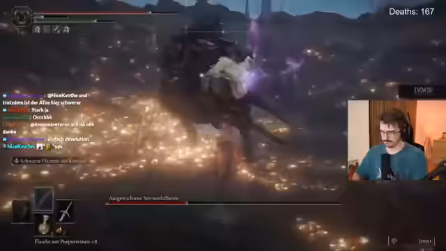 02:40:59Im weiteren Verlauf des Streams widmet sich der Streamer dem Kampf gegen mehrere Godskin-Noble, wobei er Schwierigkeiten hat, deren Angriffsmuster zu lesen und auszuweichen. Dies führt zu mehreren Versuchen und Toden. Es wird die erwähnte Kooperation mit seinem Freund Max erwähnt, der ebenfalls Elden Ring spielt und der Streamer zeigt Interesse an einem Duo-Projekt.