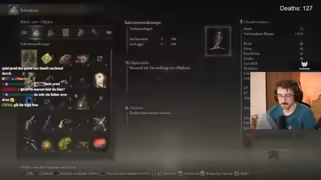 03:11:44Der Streamer führt einen sogenannten Clown Run durch, bei dem er vorgeblich schwache Waffen verwendet, feststellt aber, dass sich diese durch Mechaniken des Games unerwartet stark anfühlen. Er analysiert Builds von anderen Spielern, die er in Videos gesehen hat, und diskutiert deren Effektivität. Dabei vergleicht er verschiedene Waffen und Talismane, wie Blutklingen oder Blitzwaffen, und experimentiert mit Level-Umverteilungen, um bestimmte Builds zu testen und zu optimieren.