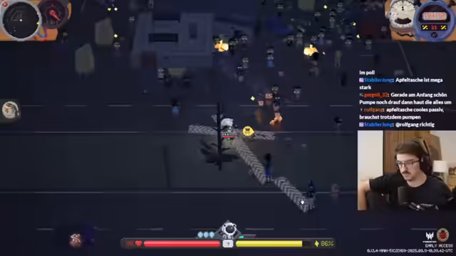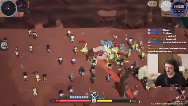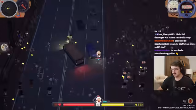 04:01:01Der Streamer experimentiert mit verschiedenen Gameplay-Strategien, einschließlich des Einsatzes von Dynamit zur Gebietsreinigung und dem Sammeln von Loot. Es wird überlegt, ob es sich lohnt, in Rüstung zu investieren, und die Effektivität verschiedener Waffen und Add-ons wird bewertet. Der Copyshop wird als OP (Overpowered) bezeichnet, da er das Kopieren von Waffen ermöglicht, was zu unerwarteten und mächtigen Kombinationen führen kann. Der Streamer entdeckt, dass der Copyshop sogar die SMG kopiert, was zu einem unerwarteten Vorteil führt. Es wird überlegt, welche Items kopiert werden sollen, wobei die Astronautenrüstung in Betracht gezogen wird. Der Fokus liegt auf dem Erreichen von 100% Crit-Chance und der Optimierung des Builds für maximalen Schaden und Reichweite. Der Staubsauger wird aktiviert, um Loot einzusammeln, und es wird über die Vor- und Nachteile verschiedener Items wie Zielfernrohr und Dartpfeile diskutiert. Der Streamer bemerkt, dass er seit Beginn der Runde zum ersten Mal Schaden genommen hat, was die Bedeutung von Magneten für das Einsammeln von Items unterstreicht.