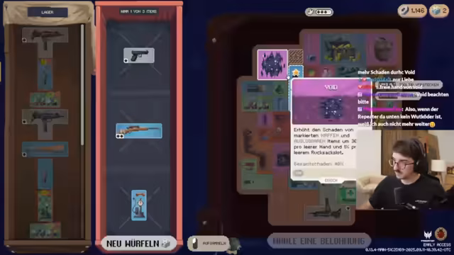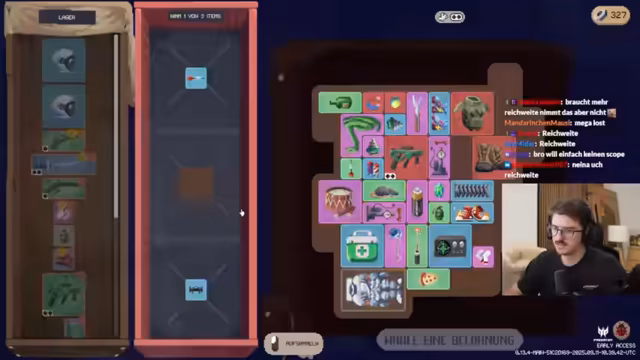 05:12:09Der Streamer stellt fest, dass keine Gegner mehr spawnen und erklärt das Spiel für durchgespielt. Er wartet auf Kevin, um gemeinsam zu zocken, und vertreibt sich die Zeit mit dem Spiel. Es wird über die Seltenheit von Apfeltaschen diskutiert, obwohl der Streamer zu Beginn des Runs viele gefunden hat. Der Streamer plant, den aktuellen Run zu resetten, da er keine neuen Items mehr erhält. Er rollt den Shop so lange neu, bis eine Apfeltasche erscheint. Der Chat wird nach Meinungen gefragt und in Entscheidungen einbezogen. Es wird festgestellt, dass die Apfeltasche im Endlos-Modus möglicherweise nicht skaliert. Der Streamer plant, alle Maps zu clearen, um satisfying zu sein. Nach dem Bosskampf werden letzte Itempakete freigeschaltet und neue Möglichkeiten eröffnen sich. Es wird überlegt, welche Fähigkeiten geskillt werden sollen, wobei Nahkampfschaden und WLAN-Repeater in Betracht gezogen werden. Der Streamer plant, alles zu maxen, bevor er in den Endlos-Modus geht, und überlegt, welchen Build er spielen soll. Der Astronaut wird in Betracht gezogen, aber auch andere Builds werden diskutiert.