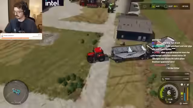 00:12:40Nach der Boxkampfanalyse wechselt der Fokus auf das Gameplay von Farming Simulator. Ein zentrales Thema sind die erheblichen logistischen Probleme. Ein riesiges, neu erhaltenes Maisfeld lässt sich nur mit einem sehr kurzen Rohr transportieren, was zu ständigen Überständen und ineffizienter Arbeit führt. Der Versuch, den KI-Helfer zu aktivieren, scheitert mehrfach, da dieser die Felder nicht korrekt erkennt. Diese Hürden führen zu Frustration, da das schnelle und effiziente Bewirtschaften der Felder unmöglich scheint und das Spielgefühl stark beeinträchtigt wird.