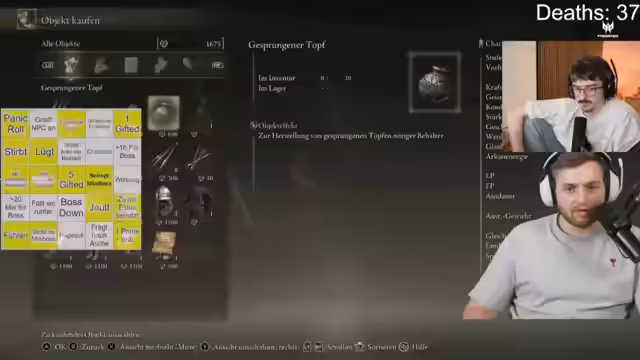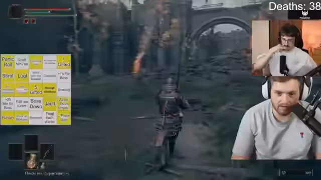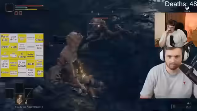 01:45:42Nach den technischen Problemen wird das Gameplay fortgesetzt und eine Bingo-Runde gestartet. Max bewegt sich durch die Spielwelt, sammelt Gegenstände wie Früchte zur Heilung ein und ist mit der Navigation und der Kartennutzung noch überfordert. Es kommt zu mehreren Toden, die vom Death-Counter gezählt werden, unter anderem durch Minibosse wie den 'Baumwächter' und einen 'Kommandanten'. Nach Rücksprache mit der Community wird deutlich, dass Max seine Spielfigur leveln sollte, um die Chancen im Kampf zu verbessern. Er findet den ersten Boss, 'Gottrick-Margit', vor, beginnt den Kampf, stirbt aber schnell.