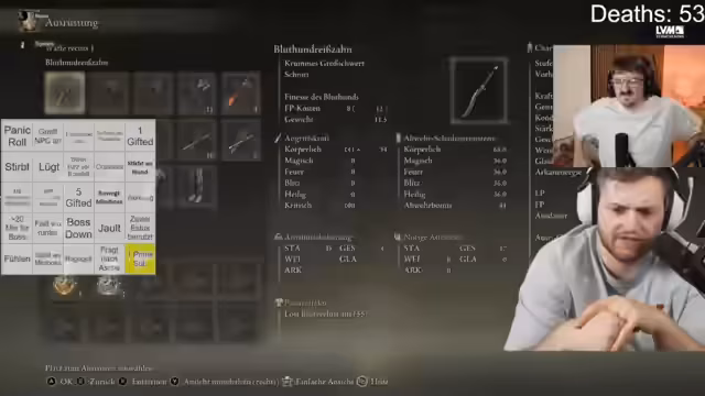 05:23:11Der Streamer kämpft mit den Grundlagen von Elden Ring, insbesondere mit der Ausweichmechanik. Er wirft oft Rollen ein, wird aber mehrfach getroffen, da er zu früh oder zu langsam reagiert. Dies führt zu viel Frust, da er Gegner wie einen mächtigen Höhlenhund, der ihn zweimal auf 1 HP gebracht hat, für unfair und übermächtig hält. Sein Hauptziel ist es, stärker zu werden und die Waffen zu verbessern, während er die Runen sammelt, um seine Basisfähigkeiten zu erhöhen.