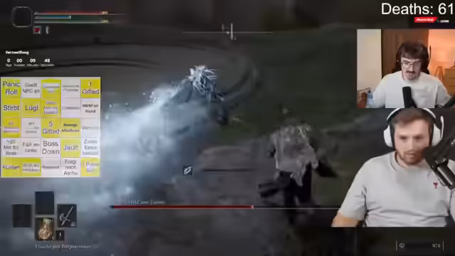 Ein gemeinsamer Stream, bei dem die Welt von Elden Ring erkundet wurde, um ein Bingo zu absolvieren. Der Fokus lag auf der Bewältigung von Herausforderungen, wie das Besiegen von Minibossen. Trotz anfänglicher technischer Vorbereitungen wurde der Fokus schnell auf das Gameplay gelegt, bei dem der Spieler mit Taktiken und der Hilfe des Chats versuchte, die Ziele zu erreichen.