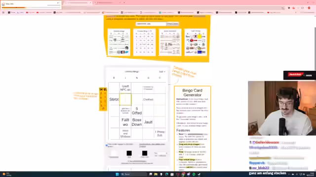 00:01:17Zu Streambeginn äußert der Streamer seine Vorfreude auf den geplanten Elden Ring Bingo-Stream mit einem anderen Spieler, Max. Er plant, massiv zu 'absaufen', also zu beobachten, wie Max das Spiel spielt, solange dieser nicht denselben Stand erreicht wie er selbst. Ein zentrales Element ist das vorbereitete Bingo mit 25 möglichen Feldern, die typische Vorkommnisse in Elden Ring abdecken, wie das Sterben an einem Mini-Boss oder technische Probleme. Die erste Stunde des Streams dient daher der finalen Abstimmung und Fertigstellung dieses Bingos.