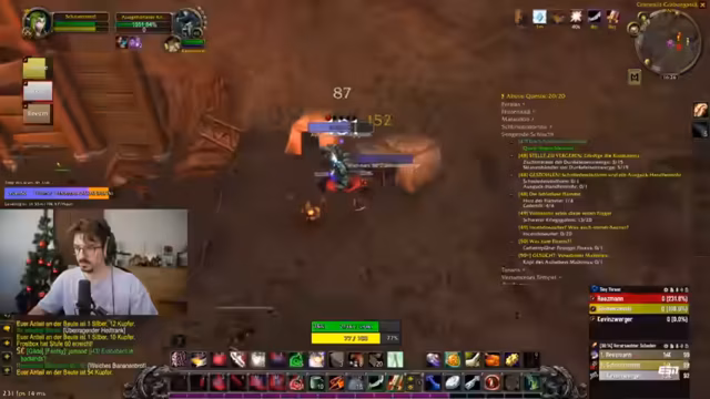 01:15:45Der Streamer plant gemeinsame Quests in der Sengenden Schlucht mit anderen Spielern, darunter Rehzmann und Kevin. Es gibt Diskussionen über das Farmen von Ressourcen wie Seidenstoff und Thorium-Bahnen für Berufe und Verzauberungen. Die Interaktion zeigt die Bedeutung von Teamwork und Ressourcenmanagement, um Endgame-Vorbereitungen wie die Feuerverzauberung zu treffen. Auch das Teilen von Quests und das Anbieten von Portälen werden erwähnt.