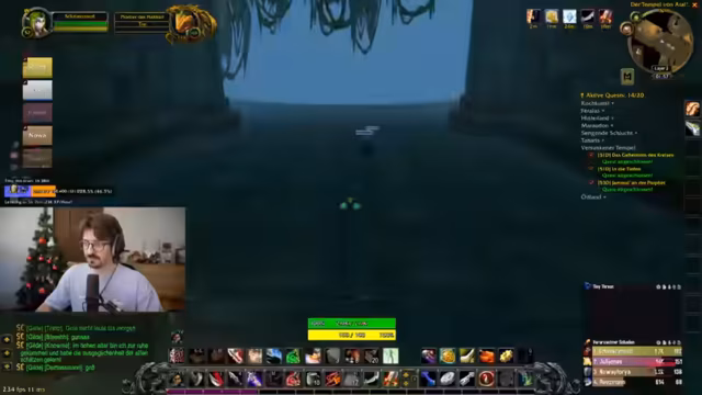 11:19:59Die Gruppe betreten den versunkenen Tempel. Sie erklären das Layout mit mehreren Ebenen und Gängen. Der Streamer zeigt einen Trick, um durch ein Loch im Boden zu fallen, ohne Schaden zu nehmen. Sie installieren eine Weak Aura für Threat-Anzeige und bekämpfen Gruppen von Trollen und Hexendoktoren. Kameraprobleme werden ignoriert, aber Taktiken für Schattenschutz und Fokus auf Casters werden diskutiert.
