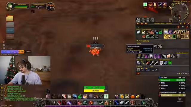 09:27:35Der Streamer handelt intensiv mit Materialien für Verzauberungen, benötigt unter anderem Seidenstoff, große Astral-Essenzen, seltsamen Staub und Seelenstaub. Im Tausch gegen diese wertvollen Rohstoffe bietet er Verzauberungen wie Ausdauer +5 auf Schuhe oder Gesundheit +25 auf Brust an. Dabei kommt es zu einem komplexen Austausch mit anderen Spielern, wobei Verzauberungsrezepte und Items für potenzielle Raid-Vorbereitungen ausgetauscht werden.