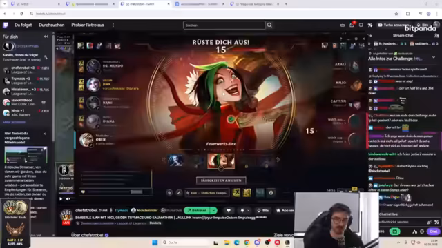 00:01:50Zu Beginn des Streams startet die Duo Ranked Challenge zwischen Max, Nici und Strobel gegen rumathra. rumathra kündigt an, den Tag mit dem Champion Victor zu spielen, da er in der Challenge bereits einen beeindruckenden Play damit hatte. Max wählt Victor, während rumathra eine Rolle als Support in Betracht zieht. Die Gegner starteten mit Senna und Miss Fortune, was rumathra als sehr nervige Kombi bezeichnet, die konstant poke wird. Max spielt den gesamten Tag Jinx, auch wenn sie gebannt ist. Eine technische Einschränkung ist rumathras reduzierte Sprechzeit, da er krank ist und nur bei Spendengesprächen reden will.