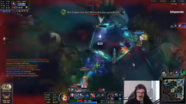05:38:22Zu Beginn des Spiels wird die Leistung der Sona positiv bewertet und als solide im Vergleich zum Vortag eingestuft. Es wird eine frühe Drachen-Szene kommentiert, bei der die Gegner mit einem Ultimativ-Angriff überraschen. Ein热议-Entwickelt sich um den gegnerischen Sylas, der als 'Scheiß-Gegenmeister' bezeichnet wird, da er häufig sein Ultimativ einsetzt und sich stark heilt. Der Chat-Vorschlag, 'Antiheil' zu kaufen, wird als 'Ragebait' und im Gegensatz zu 'Aschub' als schlechter Tipp abgetan.