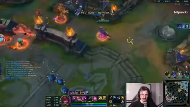 03:04:49Ein Fight um den Baron Nashor beginnt, bei dem die gegnerische Gwen einen exzellenten Fight führt. Der Streamer benennt den eigenen Kragas als das größte Problem des Teams mit einer 40%-Winrate, der trotzdem climpt. Er kritisiert das eigene Team für nicht warden und für eine schlechte Positionierung im Fight. Es kommt zu einem Disput, bei dem er seinen Mitspieler Chef Strobel dafür kritisiert, nach einem bereits gewonnenen Fight auf eine verbleibende Gegnerin zu springen und zu sterben, obwohl dieser behauptet, er habe nichts anderes tun können.