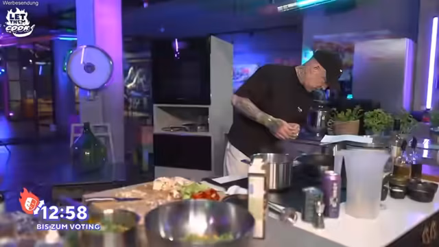 00:43:58Nach der Aufräumphase beginnt die eigentliche Herausforderung: die Zubereitung des thailändischen Currys innerhalb von 60 Minuten. Frank Rosin stellt einen Timer und erläutert, dass der Chat nach 10 Minuten einen Handicap oder Joker für einen der beiden Gäste vergeben kann. Während Monte sichtbar routiniert schält und schnitt, zeigt Abu Unsicherheit bei der Vorbereitung der Zutaten, insbesondere bei der Champignon-Schälung, was Frank Rosin positiv als 'Bauchintelligenz' bewertet. Die Zuschauer sollen nun entscheiden, welches Handicap verteilt wird.