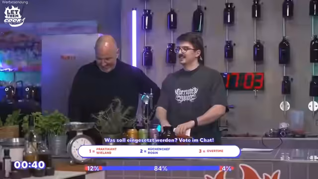 00:15:06Die sechste Sendung von 'Let them cook' wird mit den Gästen MontanaBlack und Abu gestartet. Es wird betont, dass die Zuschauer live mitentscheiden können, was gekocht wird. MontanaBlack und Abu werden als die heutigen Köche vorgestellt, die gegeneinander antreten. Die Sendung wird von Joyn unterstützt. Es wird erwähnt, dass drei Boxen mit Rezepten zur Auswahl stehen: Thai Curry, Gemüseeintopf marokkanischer Art und Chana Masala. Keiner der beiden Gäste hat je Reis gekocht. Die Zuschauer werden aufgefordert, über das Gericht abzustimmen, das die beiden kochen sollen. Frank Rosin betont, dass es wichtig ist, die einzelnen Schritte im Rezept zu befolgen und sich nicht von der Komplexität des Gerichts abschrecken zu lassen. Er ermutigt die Zuschauer, es selbst auszuprobieren und betont den 'Bildungsauftrag' der Sendung, Menschen zum Kochen zu inspirieren.