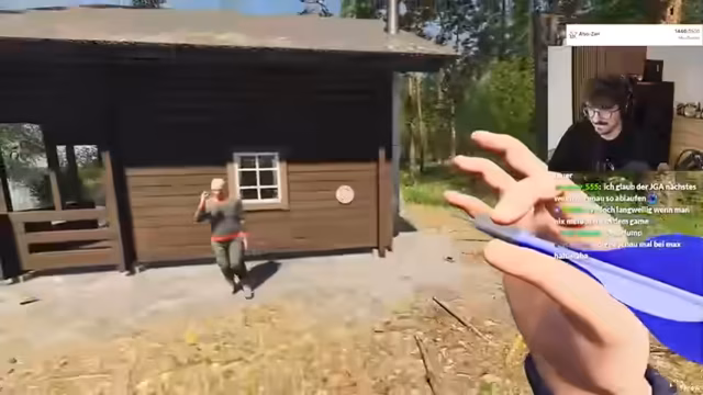 04:41:21Der Streamer und sein Kollege fahren im Urlaubssimulator ziellos um einen See, suchen den Supermarkt und werden dabei im Kreis herumgetrieben. Sie machen einen Reset und landen an einer Stelle, die optisch identisch mit dem Startpunkt wirkt. Dabei stoßen sie auf ein Haus mit drei Wespen-Nestern. Nach einem weiteren Reset entdeckt einer der beiden eine Wurst in der Hand. Im Verlauf des Gesprächs töten sie versehentlich einen NPC, was zu einem erneuten Reset zwingt. Ihre Suche nach dem Supermarkt gestaltet sich als äußerst frustrierend und zeitaufwändig.