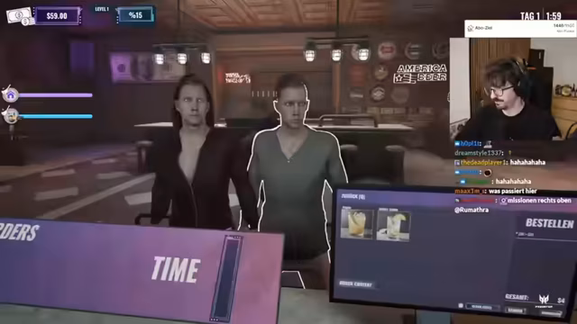06:15:43Nach anfänglichen Schwierigkeiten entwickelt der Streamer eine klarere Strategie. Er erkennt, dass Getränke teurer verkauft werden müssen, um profitabel zu sein, und konzentriert sich darauf, komplexe Mischgetränke wie 'Double Ember with Orange' zu bewerben. Die Popularität steigt signifikant an, was zu mehr Umsatz und der Freischaltung neuer, lukrativer Optionen führt.