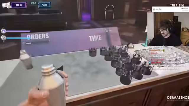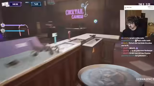06:38:05Fokus liegt auf der Zubereitung von Getränken und dem Betrieb des Clubs. Der Streamer versucht, neue Rezepte wie 'Electric Blue' (Gin, Lemon Juice, Sugar Sirup) oder 'Midnight Smash' (Whisky, Eggs, Sugar Syrup) zu mixen. Gleichzeitig kämpft er mit Problemen im Club: Popularity sinkt, der Umsatz ist gering und ein Gast kotzt, was aufgeräumt werden muss. Trotzdem werden neue Automaten wie ein Kondomautomat und eine Discoball gekauft, um die Attraktivität zu steigern, obwohl das Budget schnell erschöpft ist.