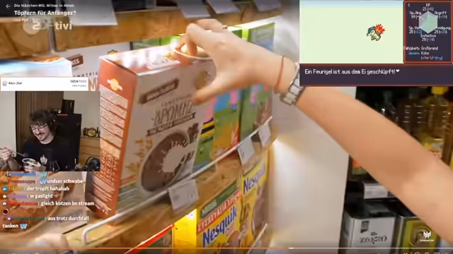 09:37:16Die Streamer diskutieren über den Alltag der Mädchen in der WG. Sie sprechen über die ungesunde Ernährung, die aus fast ausschließlich Nudeln mit Butter besteht. Eine Diskussion entbrennt über die Essbarkeit von Kiwi mit Schale, was für die Streamer und den Chat undenklich ist. Später probieren zwei WG-Mitglieder das Töpfern und berichten von ihren Erfahrungen.