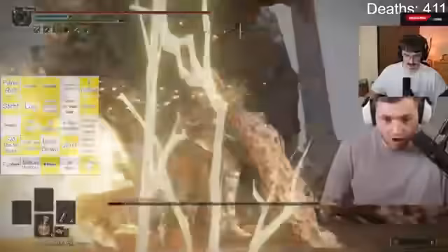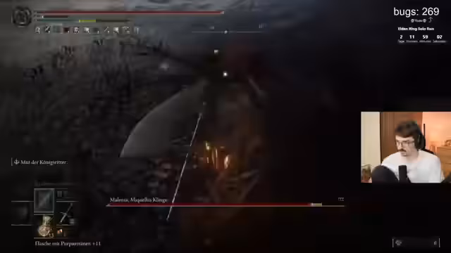 11:05:49Nach zahlreichen gescheiterten Versuchen wächst die Frustration des Streamers. Er kritisiert die 'Input Reading'-Mechanik von Malenia als unfair und äußert den Verdacht, der Boss würde seine Bewegungen vorwegnehmen. Obwohl er eine Taktik für die erste Phase entwickelt hat, findet er keine Lösung für die nervige Attacke mit den Kettensägen und die plötzliche Heilung des Bosses. Nach über 300 Toden in diesem Stream gibt er den Kampf zunächst auf und kündigt an, sich eine Taktik anzusehen und am nächsten Tag mit frischen Kräften einen neuen Versuch zu starten, da er das Spielprinzip als sehr glücksabhängig empfindet.