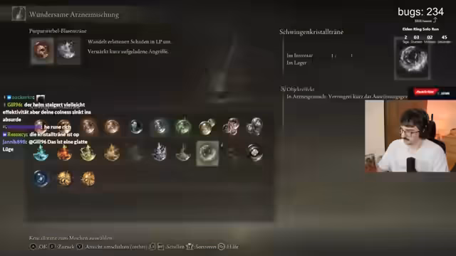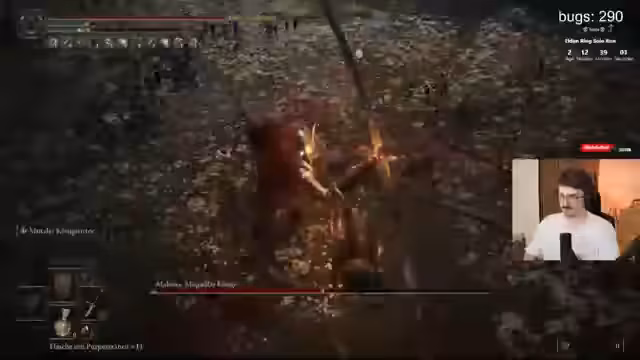 02:46:02Der Streamer wird während seiner Erkundung mehrfach von invadierenden Spielern angegriffen. Er verteidigt sich erfolgreich und nimmt deren Waffen als Beute. Er kämpft auch gegen schwierige Gegner wie die Bluthunde und die Schaumschnecken, die ihn in seine Grenzen treiben. Er sammelt wichtige Ressourcen wie Schmiedesteine und Blutfett. Schließlich macht er sich mental auf den Weg zum Kampf gegen Malenia, den er als seinen letzten, aber auch als seinen anspruchsvollsten Boss betrachtet, und bereitet sich intensiv darauf vor.