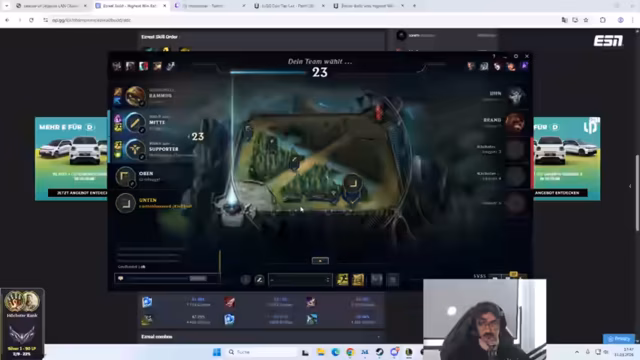 00:00:29Der Start des LiveStreams markiert den Beginn der geplanten Duo Ranked Challenge. Nach technischen Einrichtungstests und kurzem Warten auf Niki stehen die finalen Champions fest. Es wird in Teams gespielt: Romatra und Max bilden ein Team, Niki und Chef Strobel das andere. Die Stimmung ist hochmotiviert und die erste Runde beginnt mit einem taktischen Twist, bei dem die gegnerischen Teams den gegnerischen Teams Rollen vorschreiben dürfen. Die Erwartungen an die Games sind hoch, da die Teams das seit über einem halben Jahr planen.
