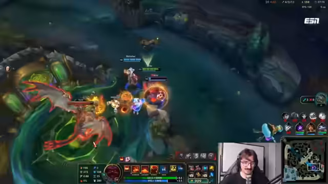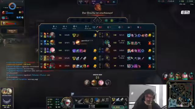 06:54:16Das Team versucht, einen Drachen zu stehlen, der 'geisteskrank' gespielt wird. Dabei kommt es zu einem Fight, bei dem der gegnerische Support mit einer 'geilen' Ultimate einen Catch landet. Der Streamer ist frustriert über das schlechte Makro-Spiel und die Entscheide der Mitspieler, wie z.B. der 'Fizz', der ohne Mana reinpringt. Es wird ein Dragon-Fight eingeleitet, wobei 'Elder Dragon' ein Schlüsselfaktor im Late Game ist.
