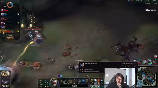 01:19:24Ein hektischer Kampf entbrennt, bei dem die Streamer um Levelvorteile und Map-Kontrolle kämpfen. Max erlebt ein gelegendliches Level-Up auf Wukong, während sein Team dringend Verteidigung an der Katharina-Base benötigt. Ein erfolgreicher Follow-up-Fight wird gefeiert, allerdings kritisiert Max eine katastrophale Entscheidung der gegnerischen Tristana. Im selben Spiel gelingt ein Pentakill mit Tristana, was den Sieg sichert, gefolgt von der Erkenntnis, dass dies der einzige mögliche Win in der Lobby ist. Die Konzentration liegt nun auf einem weiteren Win für 60 LP und dem Aufstieg in Gold.