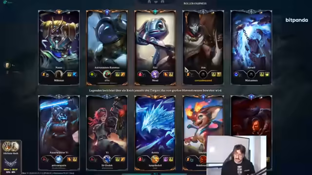 01:24:13Bei der Rollenverteilung für die Partien gibt es Unstimmigkeiten. Während die Gegner die Rollen für das nächste Spiel vorschlagen, müssen die Streamer ihre eigenen Strategien festlegen. Max äußert große Verwirrung und Unzufriedenheit mit der Support-Rolle, die er als seine schwächste Position ansieht. Nach intensiver Chat-Konsultation entscheidet er sich für Warwick im Jungle, obwohl er diese Rolle als unflexibel und passiv empfindet, besonders wenn die Lanes verlieren. Seine anfängliche Bedenken, mit Warwick gegen starke Gegner wie Shen und Kassadin bestehen zu können, werden von der Community jedoch beruhigt.